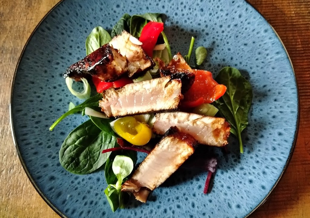 In a small jug mix the sesame oil, soy sauce, miso paste, and garlic granules to a smooth consistency. Add a couple of twists of salt to taste. Cover the tuna steaks in the paste on both sides and leave to marinade for half-an-hour (less if you’re in a hurry).