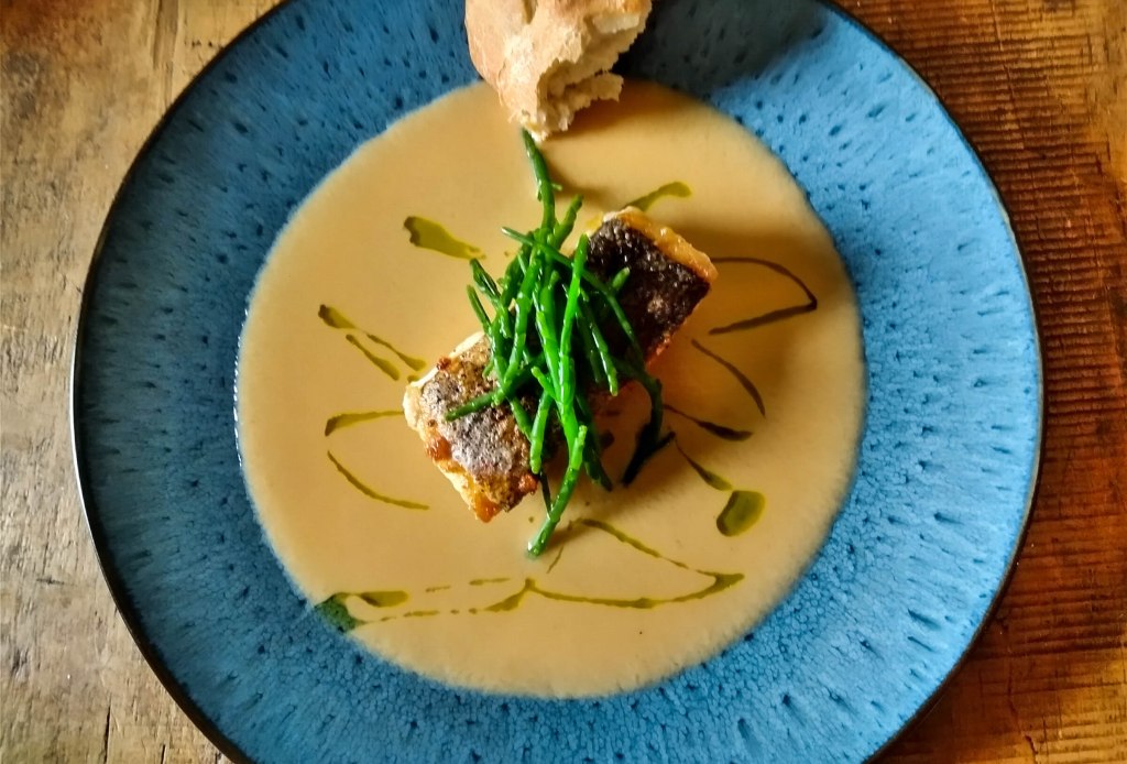 When ready to plate up carefully pour the prawn bisque onto a warmed plate and add the hake fillet. Place the samphire on top and drizzle some olive oil over the dish. Enjoy!