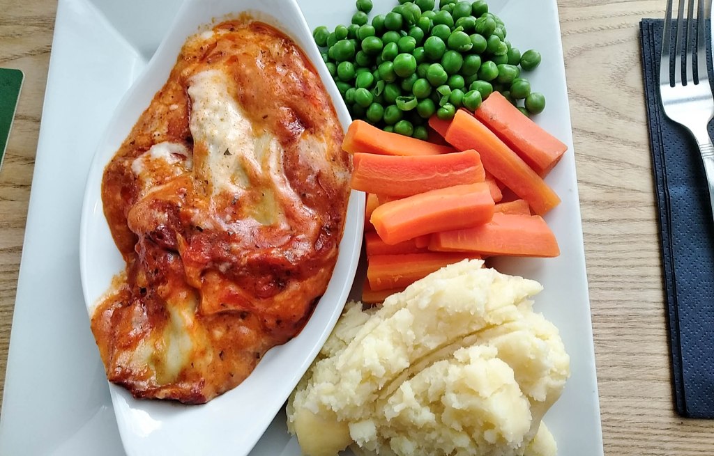 It was difficult to see how many cannelloni there were in the sauce but I’m guessing there were three. To be fair the pasta and the sauce were very tasty but the meal was let down by the dry, unseasoned (for my palette) mashed potato. The carrot batons were quite thick but, with the exception of the sauce, the meal was dry.