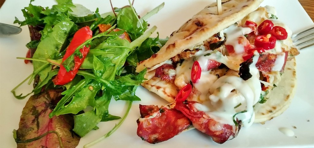 Being lunchtime we opted for something lighter off the Lunchtime Favourites menu. Mrs Wanderer went for the pulled chicken and spicy chorizo stuffed flatbread with fresh green and red chillies, garlic mayo and molten mozzarella at £11.95. I chose the shaved beef, pork and turkey deli sandwich with Welbeck caraway bread, wholegrain mustard and dill pickles at £12.95.