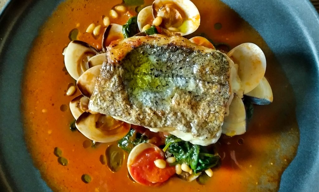 Dish up the clams in their delightful tomato and spinach sauce and top off with the hake. Add a drizzle of olive oil and voila, tis done!