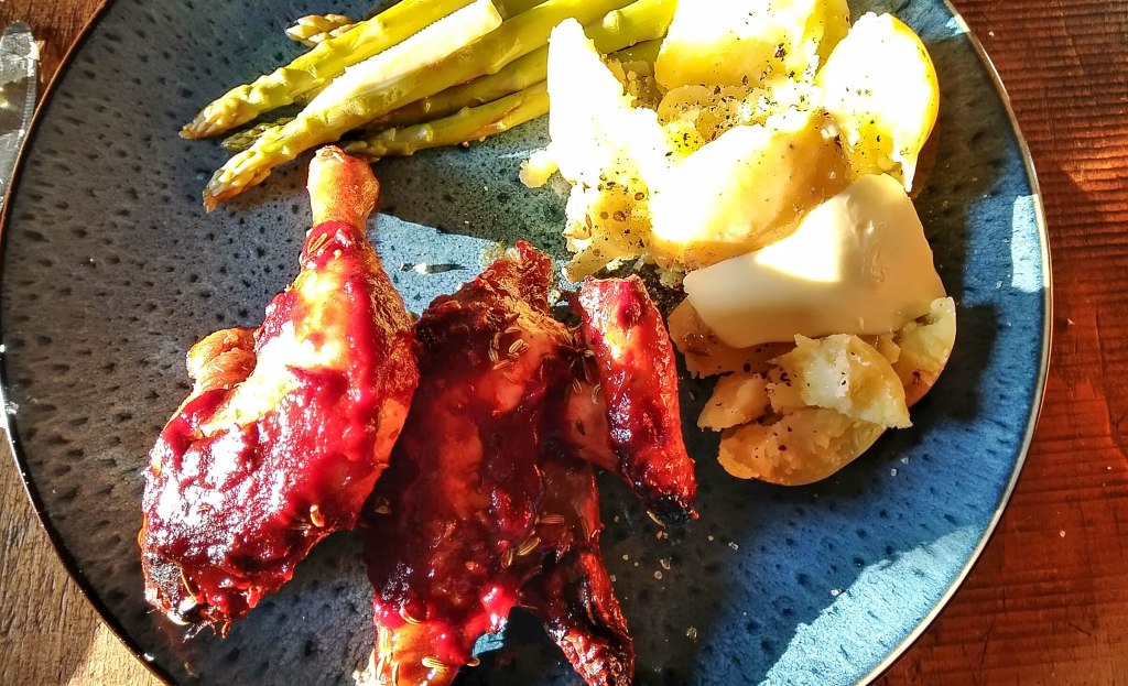 We went to Aldi the other day (get over yourself, it’s Aldi – great food!) and found that they had some lovely poussin for sale at £2.99 a bird. As Mrs Wanderer was out at book club tonight I thought I’d cook this lovely tamarind glazed poussin with crushed, buttered new potatoes (freshly lifted from the garden) and asparagus.