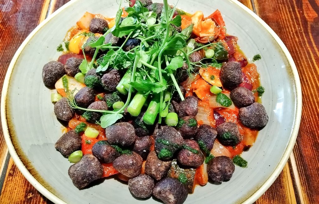 The menu gave an excellent choice of meals and I initially chose the tortellini with added prawns. Unfortunately this turned out to be unavailable so I opted for the next best dish of purple gnocchi, again with prawns, topped with pea shoots and asparagus tips. Mrs Wanderer went for one of the specials in the form of the ‘catch of the day’, salmon, with a Nicoise salad.