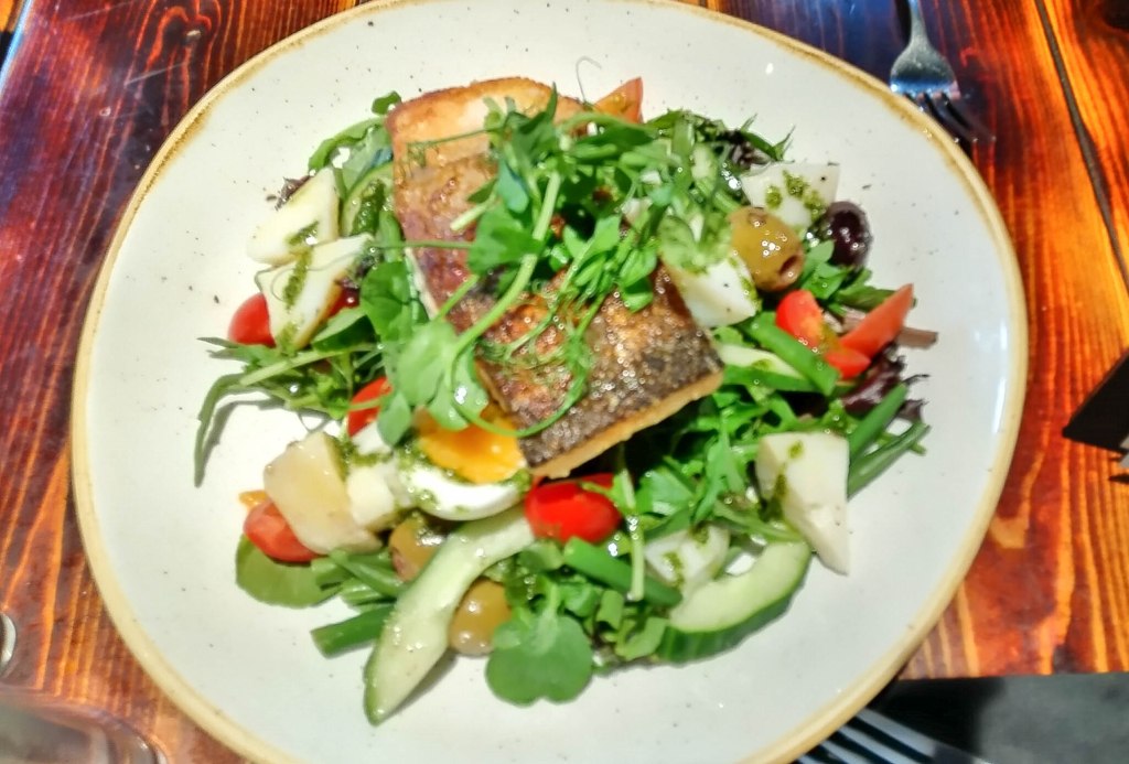 Mrs W’s salmon was delivered up in the form of a fillet resting on the salad with the customary boiled eggs and olives. They certainly didn’t skimp on the salad! She commented that the skin of the salmon was nicely crisp which is not always the case with other eateries.
