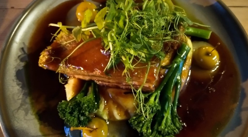 There is an online bar menu which we had previously perused and a selection of specials. Mrs Wanderer chose the Tandoori Halibut Kiev with Bombay saag aloo, spiced mango chutney, pickled carrots, edible flowers and herb oil off the specials menu and I opted for the Cider Braised Belly Pork from the bar menu. This came with creamed mashed potatoes, a sumptuous black pudding croquette, roasted baby apples the size of ten-pence pieces, burnt apple puree and tenderstem broccoli.