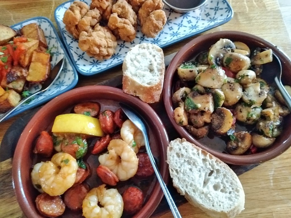 The prawns were served up with slices of chorizo, a pairing that will forever work well, “pan fried and finished with garlic butter” and came with a couple of small slices of crusty bread, as did the mushrooms, to mop up the remaining sauce. The patatas bravas were lightly crispy and the sauce was flavoursome. For an extra quid you can have them served up with aioli but given the quantity of garlic in the other plates we declined.